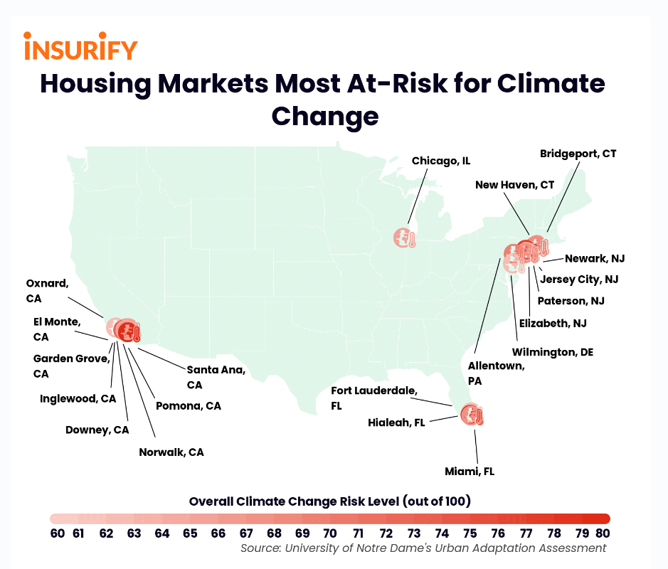 According to data from Insurify, coastal cities, perhaps unsurprisingly, are most at risk to climate change. As of 2020, the top five housing markets most at-risk for climate change include: